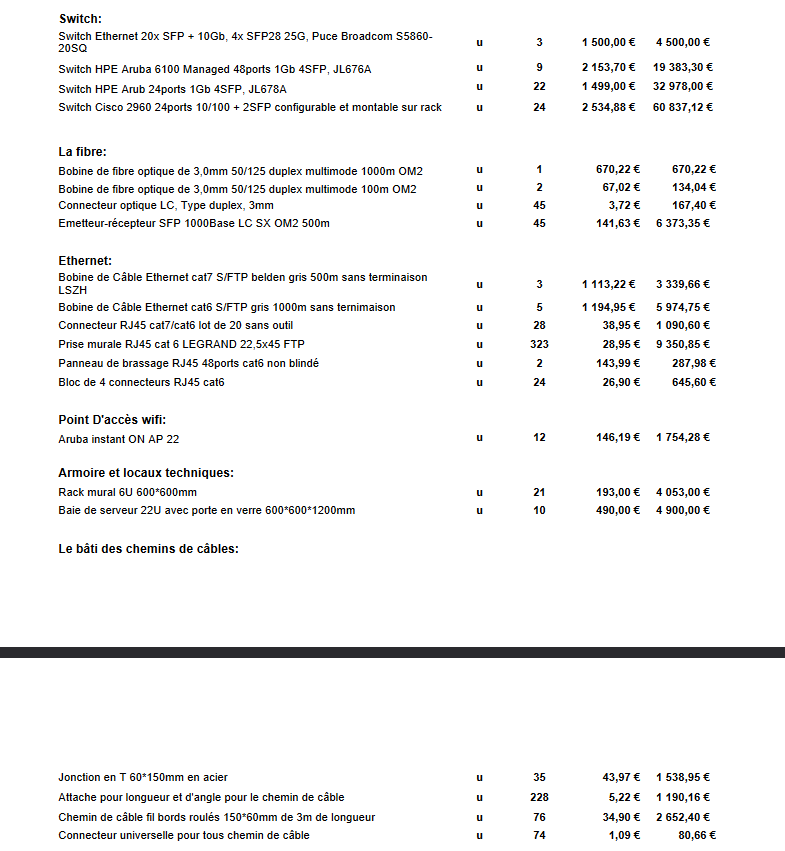 À cette fin, j'ai opté pour deux types de câbles, à savoir la fibre optique et l'Ethernet (Cat 7, Cat 6), en raison de leurs caractéristiques distinctes telles qu'un haut débit et une meilleure distance de transmission pour la fibre optique. Le choix des équipements est également crucial pour le succès de l'architecture réseau. En ce qui concerne le type et le nombre de ports disponibles, cela revêt également une grande importance dans la conception du réseau.