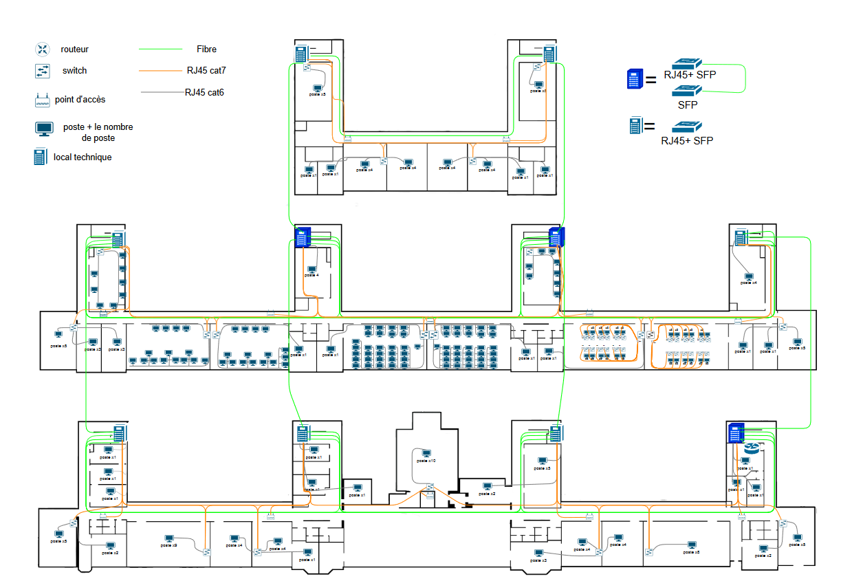 L'objectif principal de ce projet était d'agir en tant qu'entreprise (Les Tireurs de Câbles) chargée de mettre en place une infrastructure réseau opérationnelle au sein du bâtiment de l'IUT à Créteil-Vitry. Pour ce faire, j'ai examiné attentivement la structure du bâtiment afin de déterminer la meilleure répartition des équipements. La répartition joue un enjeux pour assurer un débit optimal et une distribution efficace du réseau, garantissant ainsi une expérience Internet satisfaisante pour tous les utilisateurs du bâtiment.